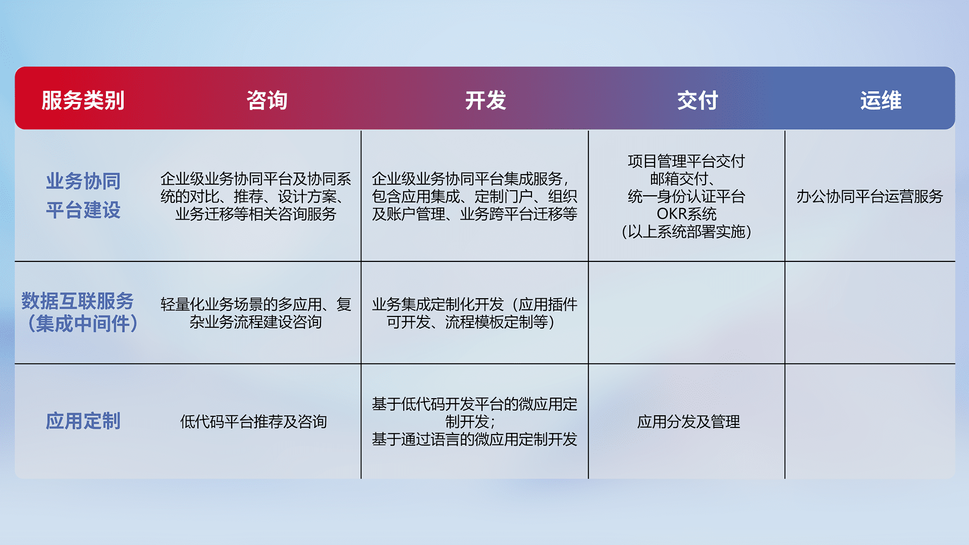 针对钉钉、、企微、、、IDaas等平台级产品提供产品的规划、、、、方案、、交付、、、定制化开发等服务,,实现如统一协同办公、、、、智能客户服务、、混合会议管理、、智能数据查询、、等业务场景,,,,实现数字化转型。。。