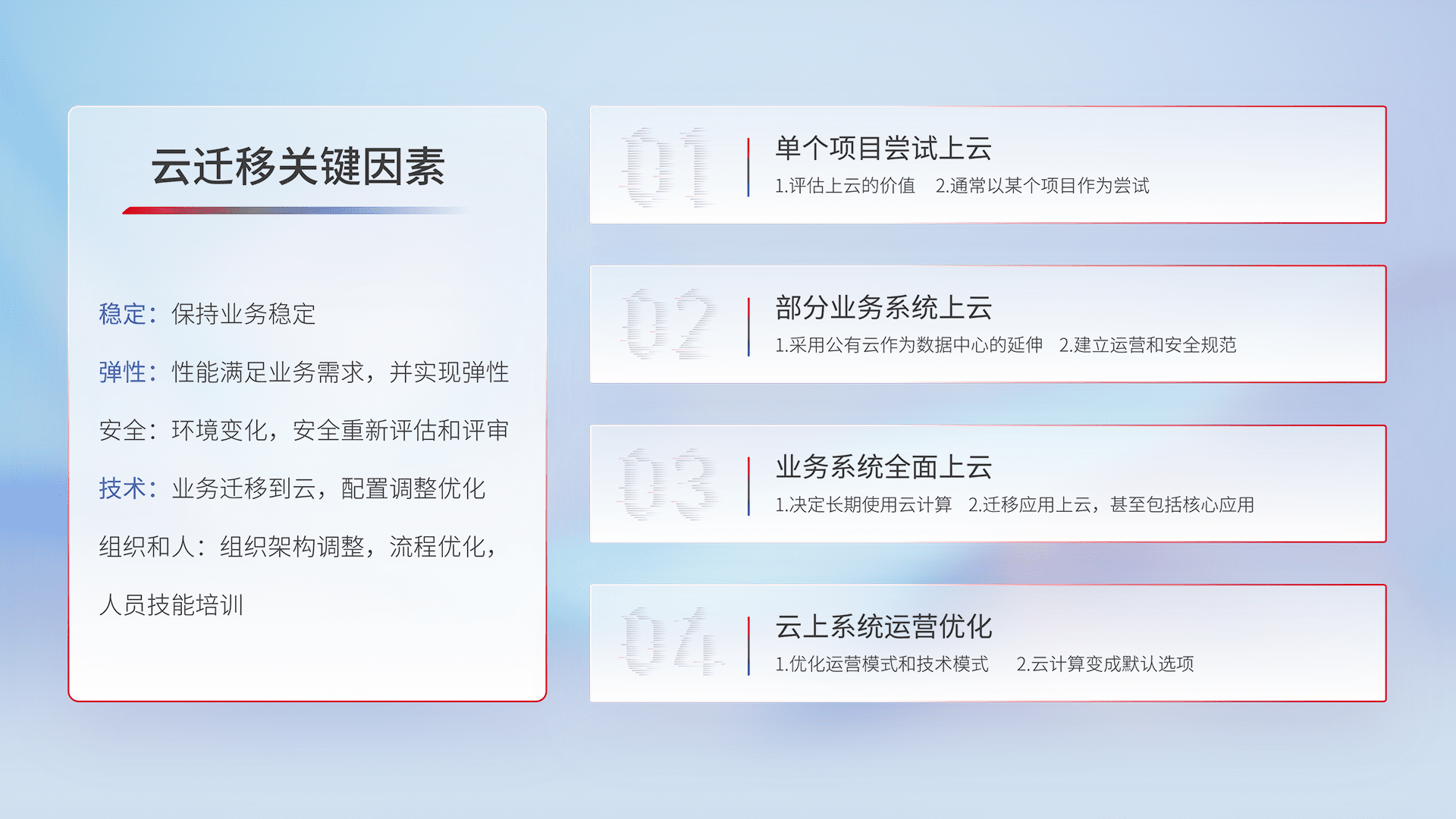 结合实际业务,,,,从规划设计、、、云平台选型、、、云原生改造、、数据迁移、、集成交付,,,迁移全过程为客户识别最佳上云路径,,,,做好风险识别管理,,,,设计网络架构、、、身份权限、、、安全审计合规、、、、操作审计、、、日志审计、、监控告警策略、、、、多站点容灾设计等,,,对云上基础设施进行整体规划,,提升IT治理水平,,,,以满足弹性、、、高可用、、、高性能的需求。。。。